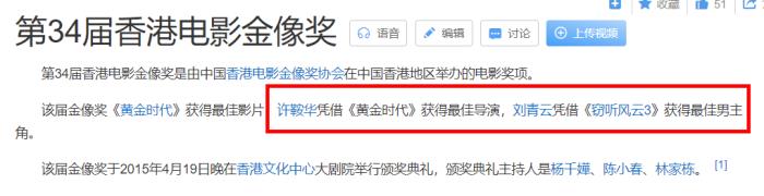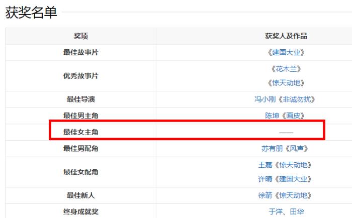 凭电影《亲爱的》获第34届香港电影金像奖最佳女主角奖,在前言里面,只有最佳导演跟最佳男主角的信息,最佳女主角这个奖项被整体删除。
