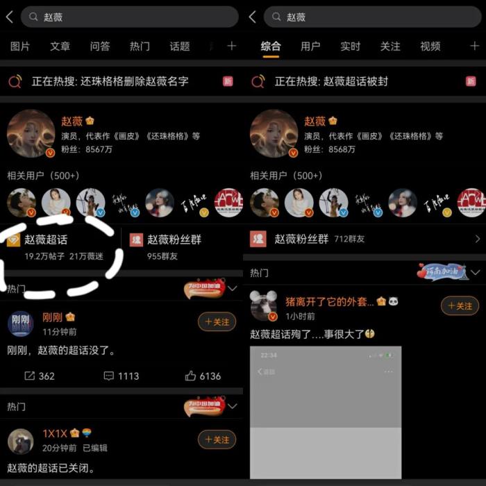在下架作品的同时,赵薇微博超话也被封,搜索相关的词条,已无法显示。