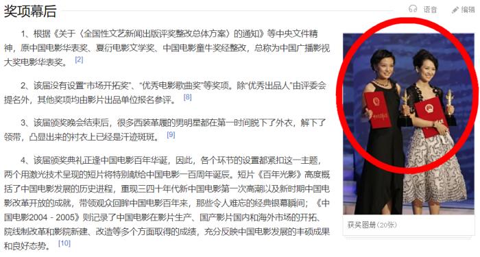 同样是《情人结》获第11届中国电影华表奖优秀女演员奖,赵薇与章子怡一共领奖,合照还在,章子怡的名字也在,“赵薇”已删除。
