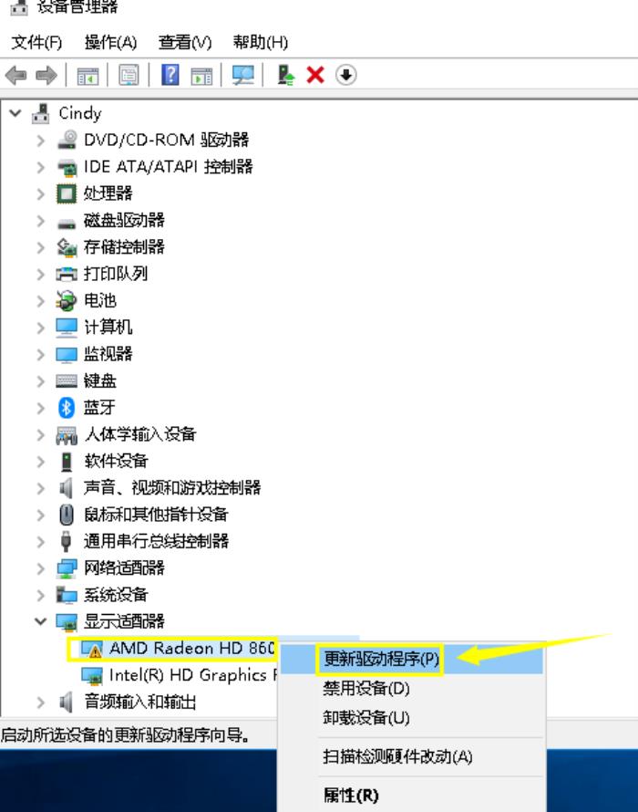 4.右键单击需要更新的图形卡,然后选择“更新驱动程序”