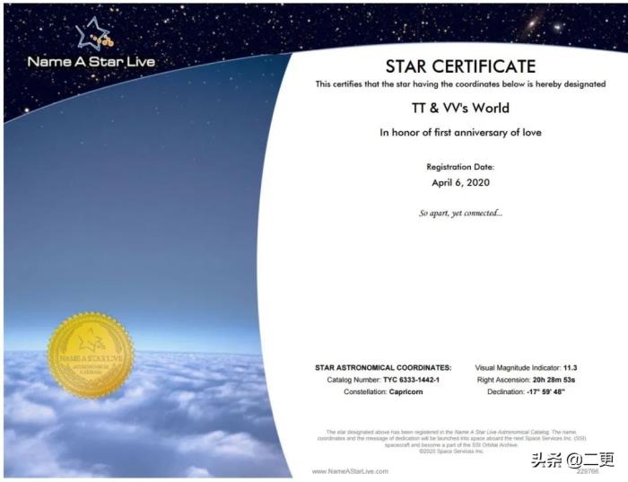 刚异国时,我经常做着题目想到他眼泪就掉下来了,曾经近在咫尺的人变成了无法触碰的“电子宠物”。为了让我有被陪伴的感觉,他买了许多周边与情侣装寄回国。而我也在一周年时,买下了一颗摩羯座小行星的命名权。不管抬不抬头,他都会知道有一颗特殊的星星永远陪在他身边。