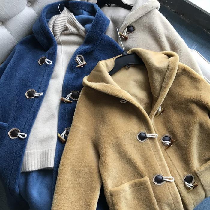 中长款。牛角扣,白色麻绳的设计。还蛮减龄的。不像那种纯羊剪绒大衣,穿不好就很...土豪...