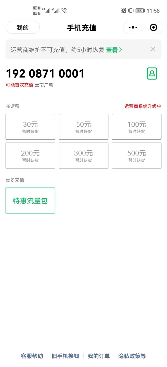 现在据网友反馈,微信钱包中我的手机充值已支持识别中国广电 192 号码,显示“可能首次充值 云南广电”,目前提示“运营商维护不可充值”“运营商系统升级中”等,话费充值暂时缺货。
