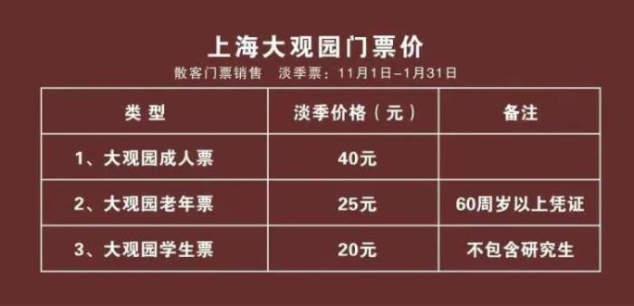 上海大观园发布门票价格调整公告,公布了淡旺季的门票价格,以及优惠政策。