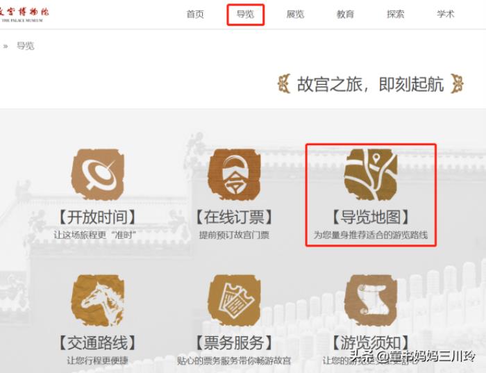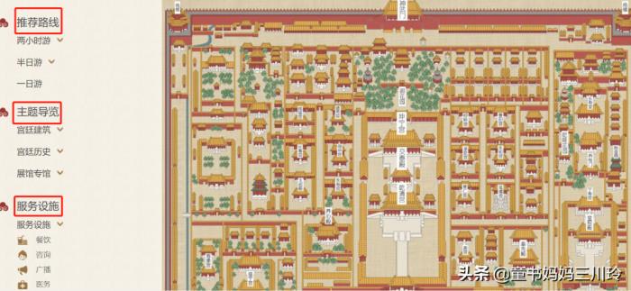 先说故宫官网,有两款,一款面向成人,一款面向青少年和儿童。故宫导览位于成人款故宫官网,第一个要推荐的当属导览栏目里的“导览地图”。如下图: