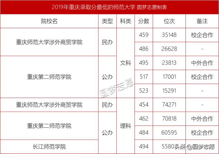 不少朋友都以当上老师为梦想,希望在高考后,能够选择一所师范大学,为自己铺垫教师的专业知识,逐步接近自己的梦想。本期,圆梦志愿就将为大家介绍二本分数较低的师范院校,以及重庆最好的师范院校。