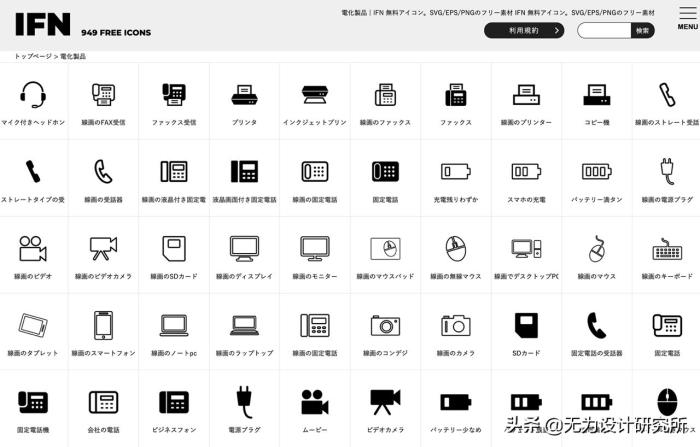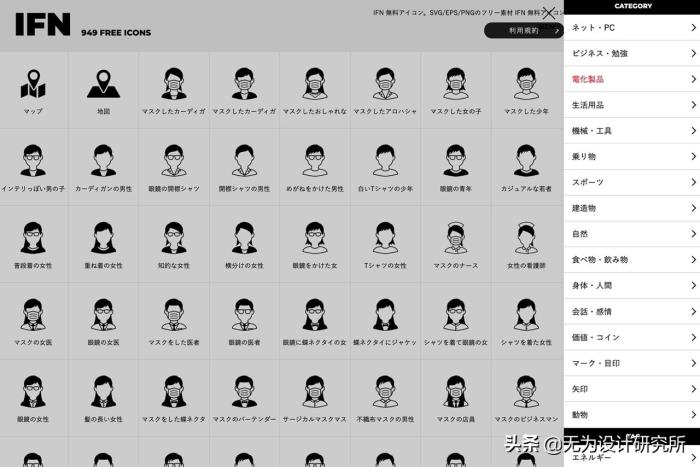 开启「IFN 无料アイコン」网站后会看到各种图标图片预览,点选右上角选单、依照图片分类进行搜索筛选,如果看不懂日文也可以使用 Google 翻译转为中文,图标数量不多,浏览上也还算方便。