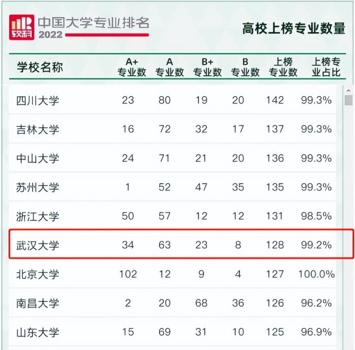 今天(6月18日),高等教育专业评价机构软科正式发布2022“软科中国大学专业排名”。排名结果显示,武汉大学共128个专业上榜,上榜总数位列全国第六。在上榜专业中,34个专业获评A+,63个专业获评A,23个专业获评B+,8个专业获评B,获评A+专业总数位列全国第九、湖北省第一。