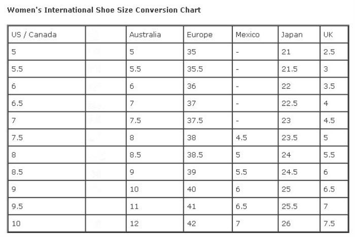 这是美国http://shoes.about.com提供的鞋码普遍对照表,基本上是很准确的,请注意我们平常所说的442指的就是表中的Europe(欧洲鞋码),你就拿Europe和US进行比对就可以了。