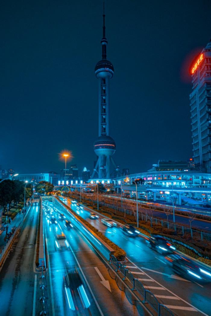 第一站是东方路与栖霞路交叉口的天桥上,好多摄影师来这里打过卡,还有人的作品得过大奖。下午到这里的时候是阴天,拍了一张感觉没啥意义,晚上有过来重新拍的,由于没有带三脚架,手持拍摄,高光度比较高。