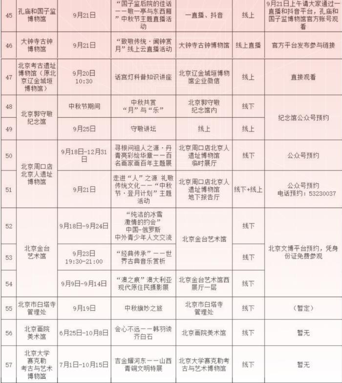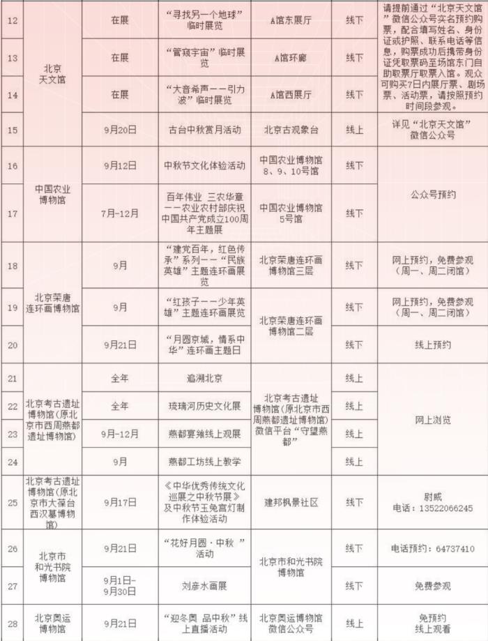 紫竹院公园以京城旧影、咏秋爱国诗词为内容举办“古都古韵”老北京照片展和诗词道旗展。北海公园在阐福寺等处举办宫廷刺绣技艺展。陶然亭公园在东门主干路沿线举办中秋民俗百科展。