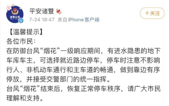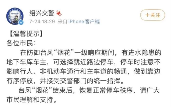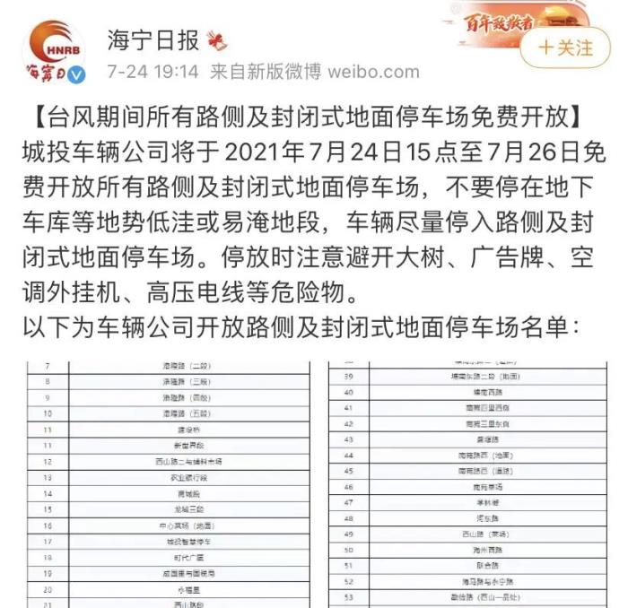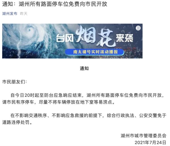 为方便广大车主在今年第六号台风“烟花”来临期间停车避险,杭州市区的道路泊位全部实施免费停放,市防台风应急响应等级降为Ⅲ级后4小时内请及时驶离。