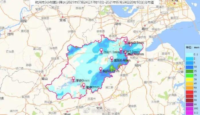 根据富阳区气象局统计数据,7月24日凌晨3点到24日14:00点,富阳全区面雨量56.3毫米,最大常绿镇化山村200.5毫米,最大1小时雨强为常绿镇化山村40.3毫米。暴雨导致常绿镇部分道路被淹,不少村庄断电。