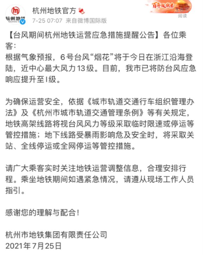 7月25日,杭州地铁官方发布台风期间运营应急措施提醒公告:为确保运营安全,依据《城市轨道交通行车组织管理办法》及《杭州市城市轨道交通管理条例》等有关规定,地铁高架线路将视台风风力等级采取临时限速或停运等管控措施;地下线路受暴雨影响危及安全时,将采取关站、全线停运或全网停运等管控措施。