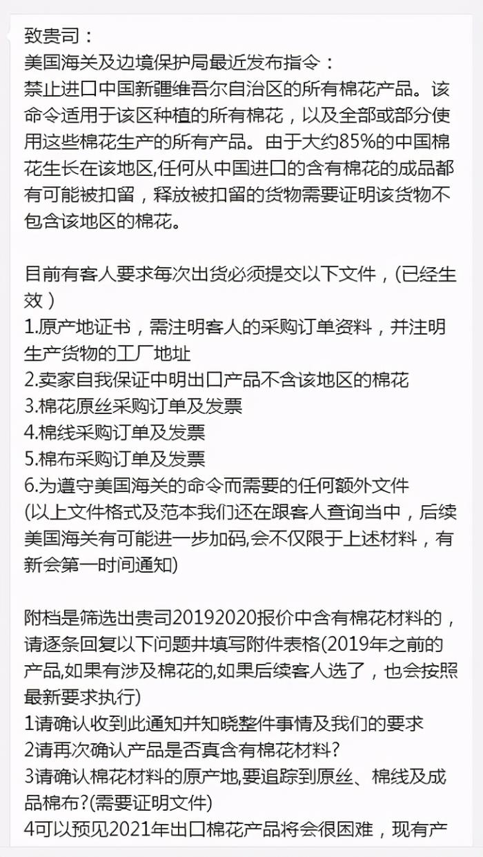 而外贸商家出货,必须提供原产地证书、自我保证出口产品不含新疆棉花、棉花原丝采购订单及发票、棉线采购订单及发票、棉布采购订单及发票等等溯源资料,从棉花到纱的合同,采购单,付款证明,基本拒绝了使用国内的棉花。