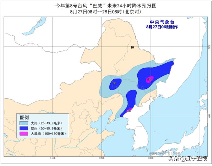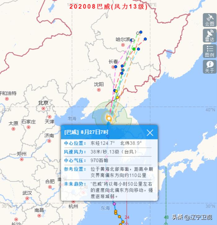预计,“巴威”将以每小时40-50公里的速度向偏北方向移动,即将于今天上午在朝鲜平安北道到我国辽宁省东港市一带沿海登陆(台风级,12级,33-35米/秒),登陆后逐渐转为北偏东到东北方向移动,穿过东北三省,强度逐渐减弱。
