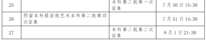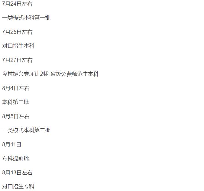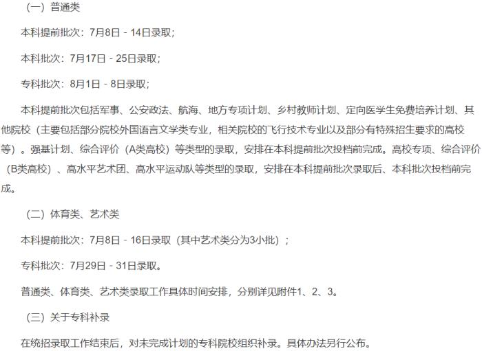 根据安排,本科提前批录取时间为7月6日至14日。特殊类型招生录取时间为7月15日。本科普通批录取时间为7月16日至21日。考生填报专科志愿时间为7月21日至22日。高职单招录取时间为7月23日至26日。专科提前批录取时间为7月23日至27日。专科普通批录取时间为7月28日至30日。