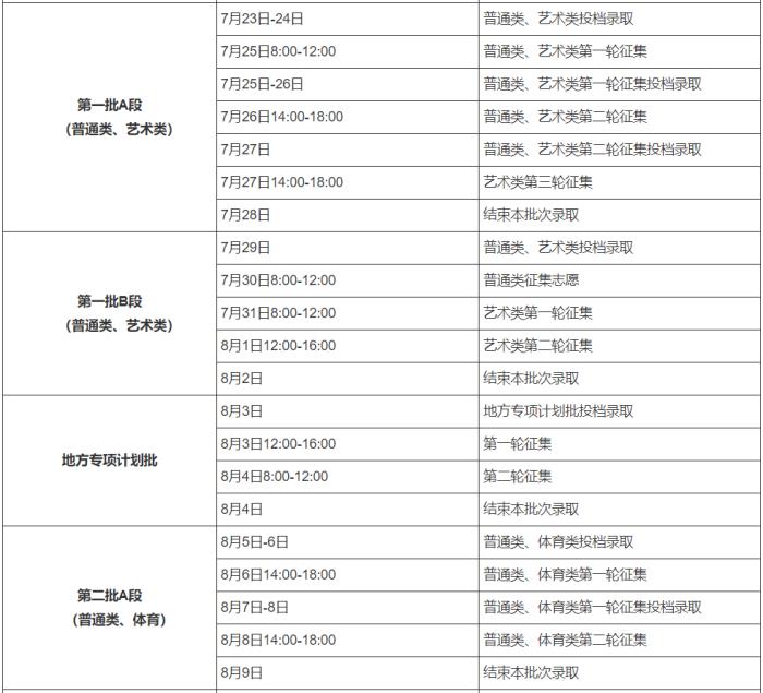 注:本表所列仅为录取工作计划时间,由于录取进程受多因素影响,个别批次实际投档录取时间变化的可能较大。如当前批次的录取进程延误,将影响下一批次或后续多批次的投档时间。