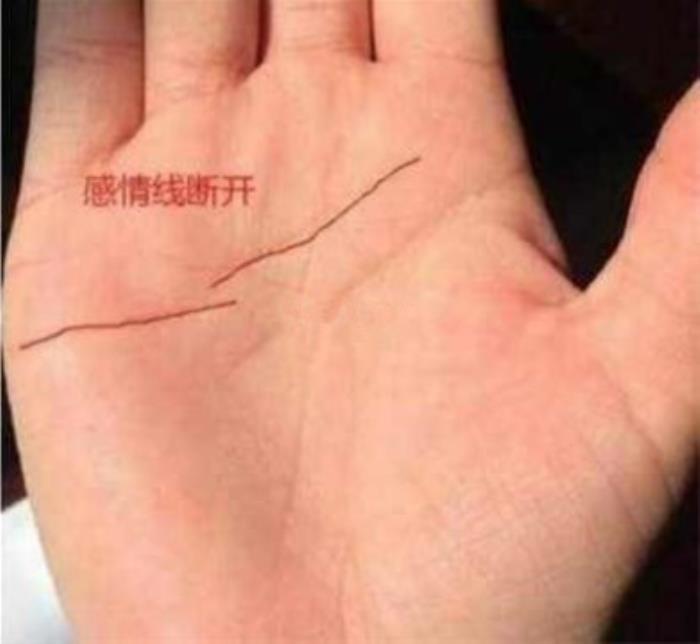 感情线断裂分成二段的人,像这种手相的人不论男女,做事都比较容易情绪化,喜怒无常并且还有点神经质,在工作中也要注意处理好与上司的关系,在对待爱情上也不太坚定,因此比较适合晚婚,早婚的话容易二婚