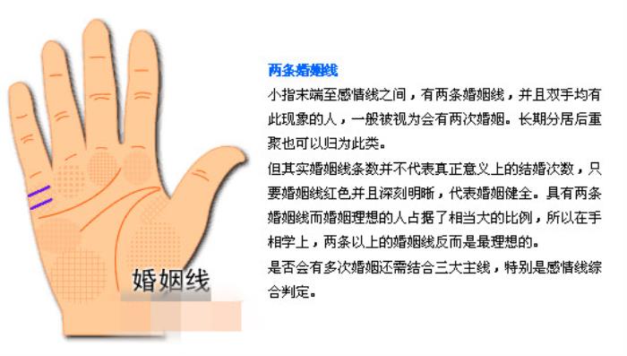 双重婚姻线,也就是指手掌中有两条平行的婚姻线。这种婚姻线不是代表着其人一生有两次婚姻,而是说明自己的运势很容易受到婚姻的影响。一般来说在结婚之后就可以迎来财运的转变,但需要注意避免因为过于关注事业和财而忽略了夫妻之间的情感交流。