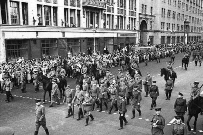 这次阅兵让德国受到了极大地侮辱,苏联把德军的队伍分成90个方队,然后整个队伍都被全副武装的苏军押送,阅兵式开始,走在最前边的是德军的19名军官。