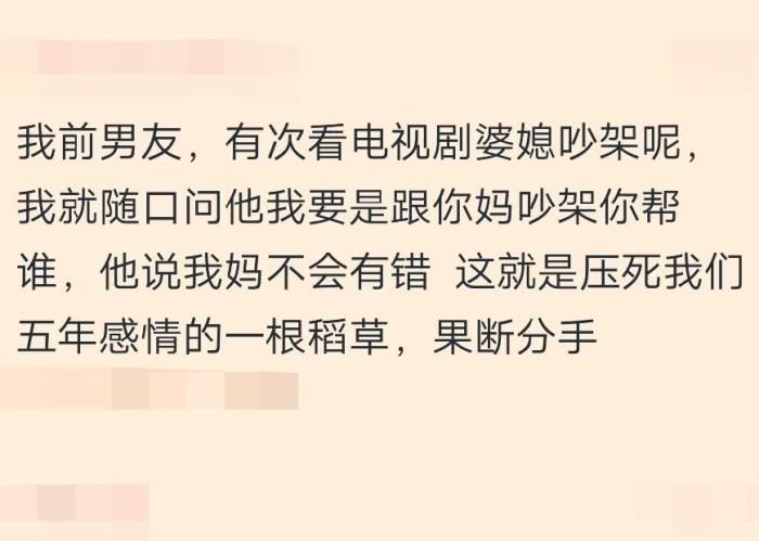 网友:我堂哥就是妈宝男,家里大大小小的事情都听伯母的,有一次婆媳矛盾,我堂哥对我堂嫂说,妈就一个,媳妇可以再找。我堂嫂人很好,但是居然忍了,我直接怼我堂哥,你妈有你爸护着。你媳妇儿你都不护着,以后对你就更心灰意冷了,果不其然,第二次婆媳矛盾她就走了,现在伯母后悔去求原谅。