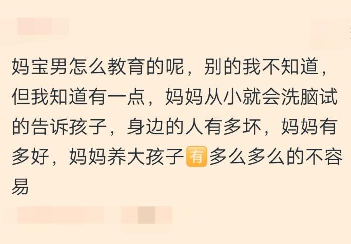 网友:我邻居,孩子上高中的时候,每天早上都要进妈妈的被窝抱一会儿才能上学,大学的时候谈恋爱,研究生毕业计划结婚,结果女的提出分手,后来又经历三次离婚,他妈妈总说是别人的原因,其实就是婆婆干涉的太多了。