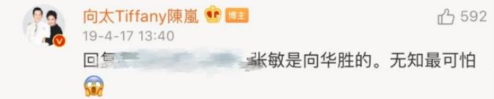 很多年后,微博时代到来,搞不清楚张敏与向华胜关系的网友,在向太陈岚的动态下将张敏与向华强联系在一起,被向太“翻牌”回复“张敏是向华胜的,无知最可怕”,也算是对张敏与向华胜当年的关系做出了官方认证。