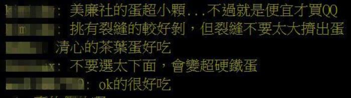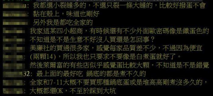 除了挑选要诀,网友也发表对各商店茶叶蛋的看法,“全家的蛋比较好剥壳”“好剥、味道淡选全家”“7-11的蛋很难剥,有一次剥了快10分钟里面还是空心的!”“OK的蛋最大颗”。