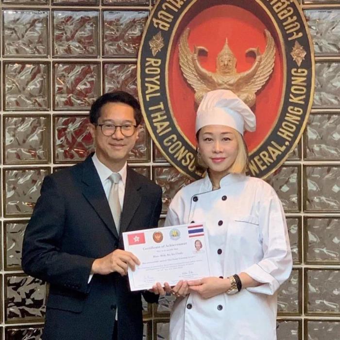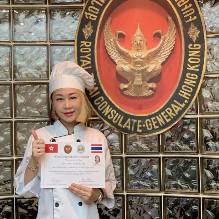 「今年的考生同学,除了我之外,全部都是职业泰国厨师或其他厨师呢!很感恩我竟然也有这机会!我承诺她们明年一定要考二级厨师证书,谢谢各人的支持!特别多谢黄仔@wonghoyinraymond,在这个重要的时刻陪伴着我,领取这个对我人生中,十分有意义的认可证。特别鸣谢 @sinhoying 师傅,和泰国皇室御用大厨成哥,多谢你们对我的信任!我才有今天的成绩!我会继续为我的新目标去进发,努力加油下去!今天终于可以名正言顺称自己为Chef KakA啦!」