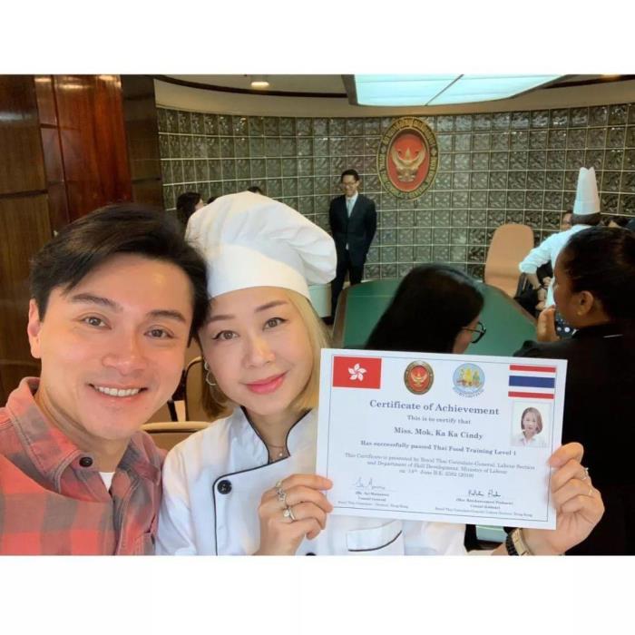 黄浩然的太太KaKa,本身是形象指导,平日都喜欢入厨乐,昨晚她在社交网分享相片,她穿起白色厨师服,原来她早前修读泰国菜,昨日去领证书,老公黄浩然当然在场见证这一刻,他亦在社交网分享喜悦,「恭喜黄太考获『泰国菜的一级证书』,感恩能见证她每个重要时刻。」