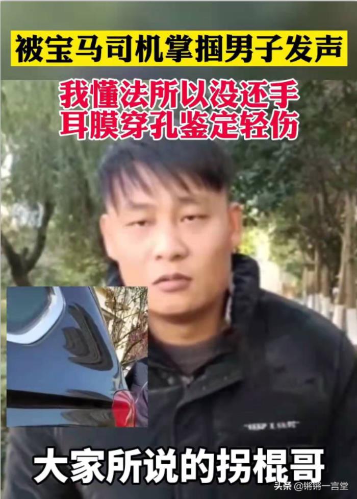 2021年12月4日,逆行的宝马车主不肯后退又暴躁,对伤病在身的“拐棍哥”破口大骂、大打出手,宝马男车主使出了吃奶的劲儿,咬着牙打、喊着号打、几乎助跑打,实打实地扇了“拐棍哥”3记重重的耳光!