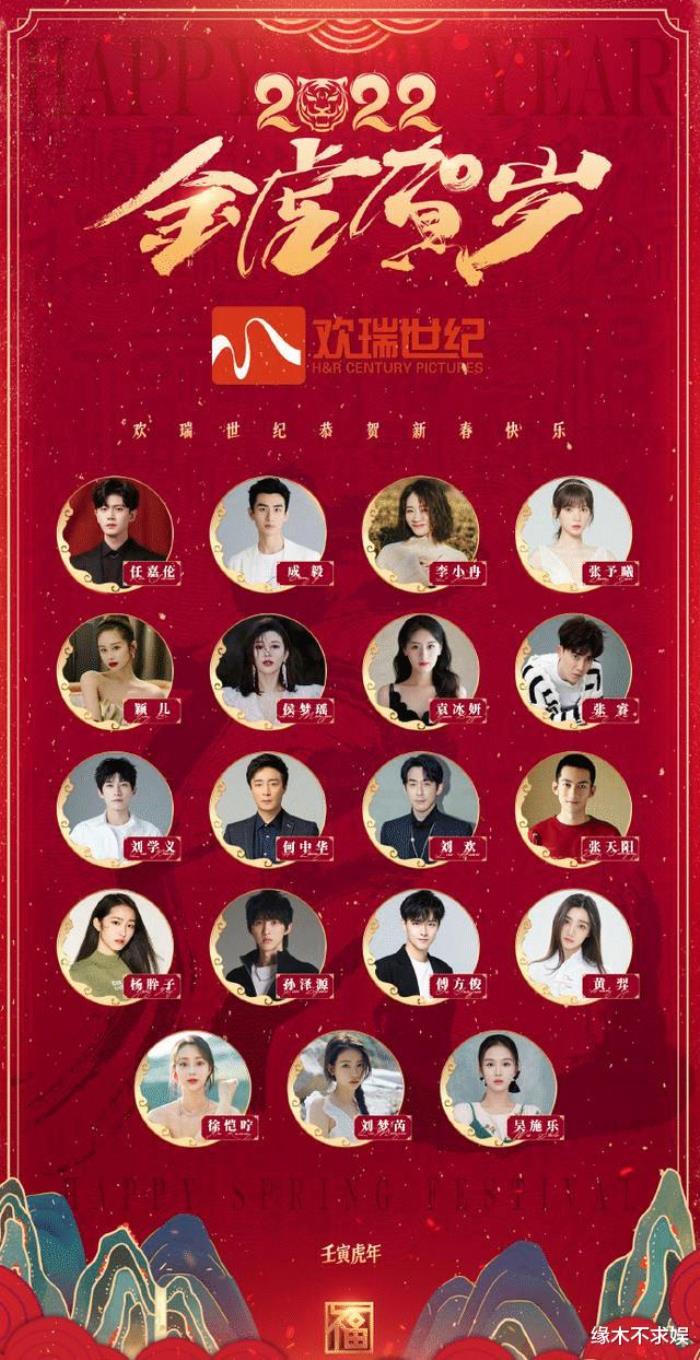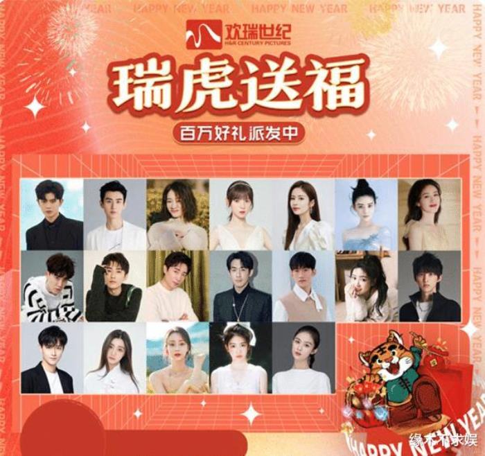 在除夕之夜,欢瑞世纪发动态称:金牛辞旧岁,萌虎贺新春,欢瑞世纪全体艺人祝您虎年虎虎生风,新春大吉!并晒出了一张海报——