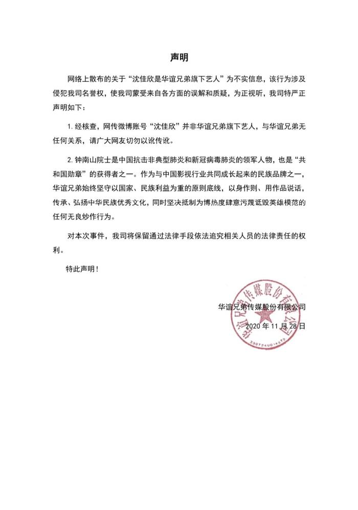新京报讯 近日,账号名为“沈佳欣”的博主发布不当言论,引发网络热议,有网友爆料称“沈佳欣”是华谊兄弟旗下艺人。11月28日晚,华谊兄弟在官方微博发布声明称,该人与华谊兄弟并无任何关系,公司坚决抵制为博热度肆意污蔑诋毁英雄模范的无良炒作行为。 声明中还表示,该行为涉及侵犯公司名誉权,华谊兄弟将保留依法追究相关人员的法律责任的权利。