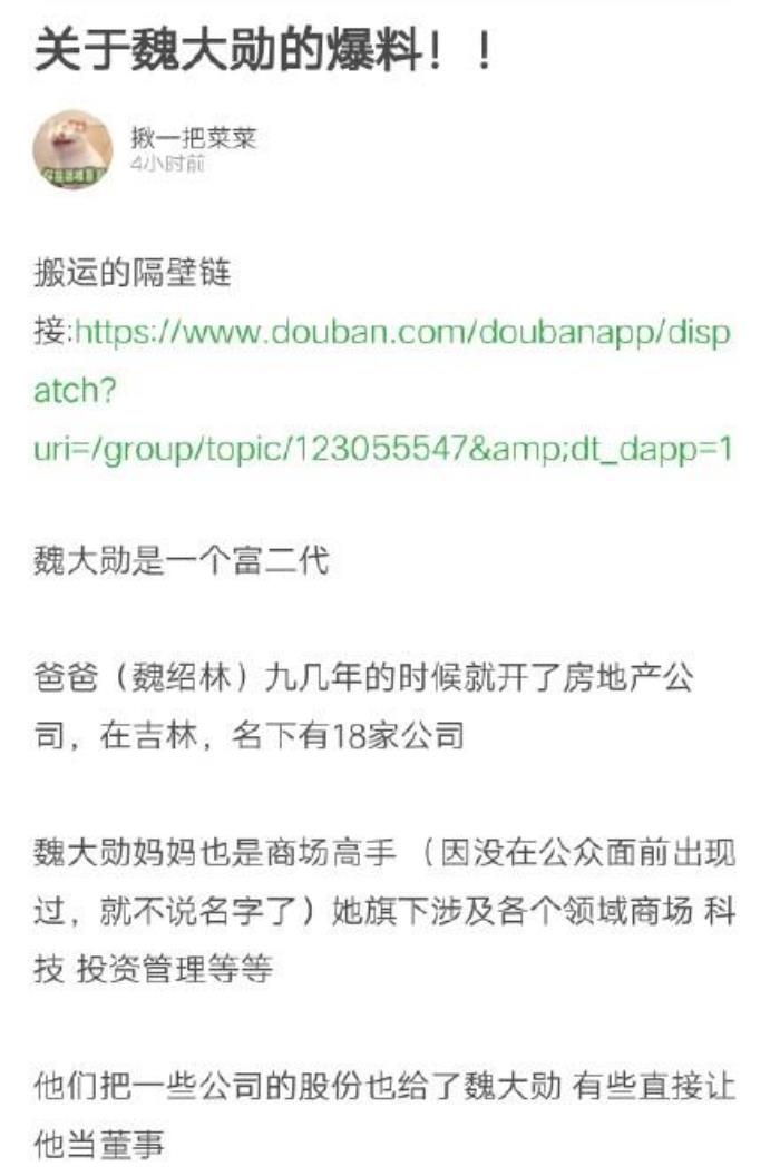 就在这两天,有网友爆料说魏大勋的爸爸九几年的时候就涉足房地产领域,名下一共有18家公司,而魏大勋的妈妈也是商场高手,涉及商场、科技、投资管理等多个领域,他的父母还把一些公司的股份转给了魏大勋,还让他担任公司董事↓