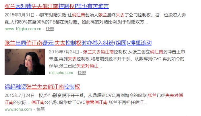 2008年不甘让“俏江南”就此倒闭的张兰与鼎晖资本签下对赌协议,鼎辉资本以两个亿的投资。换取张兰手中10.526%的股份,条件是“俏江南”必须在四年内完成上市。可最终,“俏江南”没有如约上市,按照约定,张兰必须以双倍的价格购回鼎晖资本的股份,但那时的张兰已经没有足够的资金完成协议。随后“俏江南”被CVC收购。张兰也因此完全失去了对“俏江南”的掌管权。