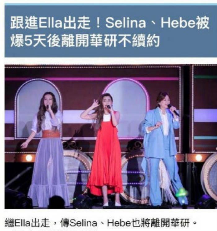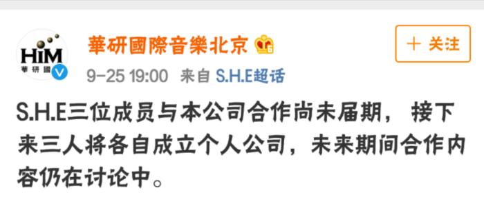 9月25日,华研国际音乐官微宣布,S.H.E三位成员与本公司合作尚未届期,接下来三人将各自成立个人公司,并表示未来期间合作内容仍在讨论中。这就意味着,继陈嘉桦(Ella)离开华研唱片公司后,任家萱(Selina)、田馥甄(Hebe)也相继解约,不过团名版权归华研。