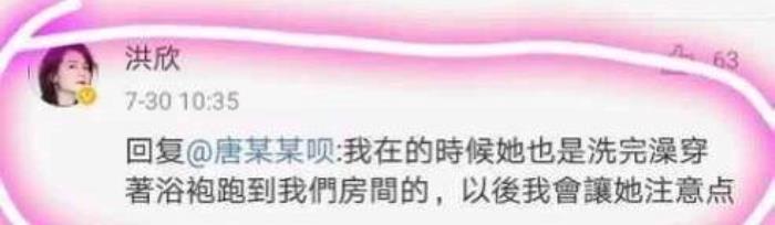 但是洪欣曾回复网友说毕滢曾穿着浴袍在他们夫妇两面前晃荡!