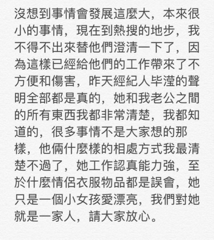 面对这些质疑,洪欣发了微博,妻子站出来力挺丈夫。称小姑娘只是爱美才会有同款情侣装的出现!妻子亲自为丈夫澄清,想必夫妻两感情一定很和睦,是不是真的是网友多想了呢?