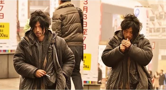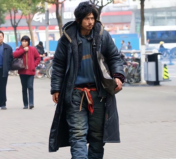照片中的男人衣衫褴褛,蓬头垢面,面庞削瘦,忧郁而深沉的眼神,配上其极具大哥风范的步伐,气质堪比超模。