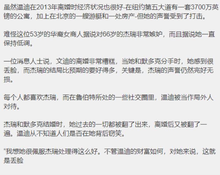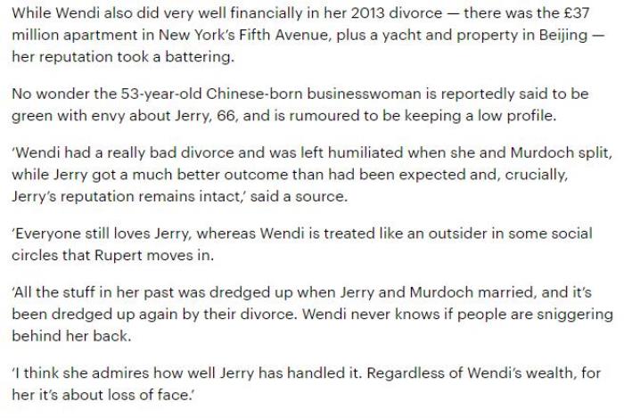 文中指出默多克的那个圈子的人,都把邓文迪当作局外人,每个人都喜欢瑞莉·霍尔,瑞莉·霍尔跟默多克结婚时,邓文迪的过往曾被深扒,两人离婚后,邓文迪又再次躺枪,成为外媒争相嘲讽的对象,知情人表示霍尔处理的手段让人佩服,不管邓文迪现在有多少钱,但那段过往就是她丢脸的事。