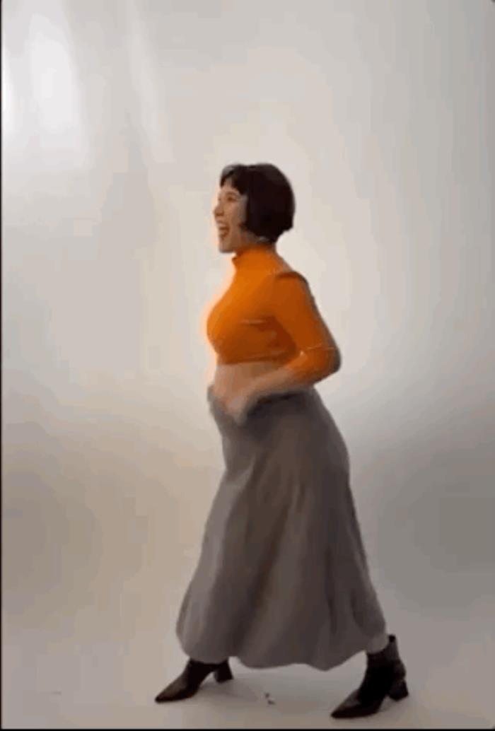 视频中,谢依霖穿着橙色的中袖半件毛衣,搭配棕色裙子和小高跟,依然是个辣妈!