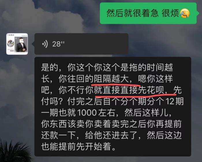 情感咨询师催促刘娜使用信贷产品分期付款。