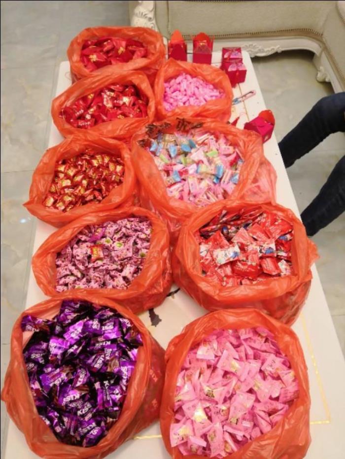 结婚前,新人家里都会准备喜糖,吃饭的时候会发给每一个吃饭的人。有些人会买小包装袋的喜糖,一小包里面有12个喜糖左右。包装袋的喜糖都是厂家装好的,有些人图方便就会买包装袋的,但是包装袋的缺点是,里面的糖不好吃,没得挑。