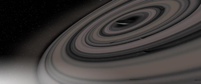 图解:艺术家在2007年描绘的土星环影像,冰冷的微粒聚集成环的固体部分。细长的丛集不断的形成和分散,最大的颗粒也只有几米的直径。