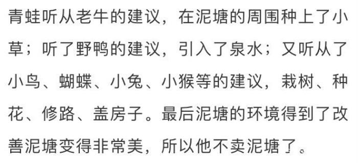 “卖泥塘喽,卖泥塘!”有一天,青蛙又站在牌子下吆喝起来,“多好的地方!有树,有花,有草,有水塘。你可以看蝴蝶在花丛中飞舞,听小鸟在树上唱歌。你可以在水里尽情游泳,躺在草地上晒太阳。这儿还有道路通到城里……”青蛙说到这里,突然愣住了,他想:这么好的地方,自己住挺好的,为什么要卖掉呢?