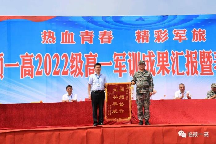 年级主任刘清为军训教官颁发锦旗。