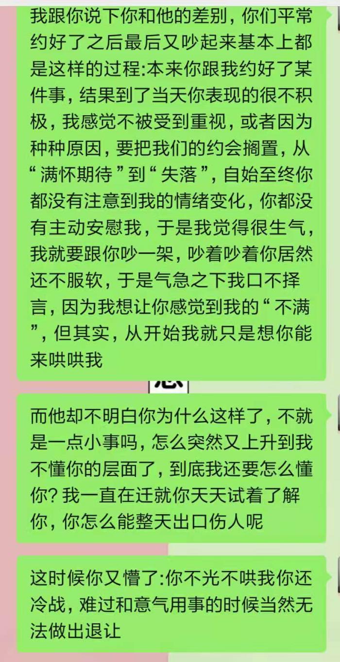 因为父亲蛮横专制,总是乱发脾气,为了不被骂和不给母亲添麻烦,他从小就很懂事,非常照顾母亲的情绪,我判断他骨子里有一种对女性的保护欲,大男子主义也很重,不能容忍女人被欺负,也不能接受女强男弱的相处模式。