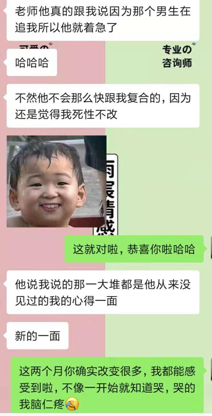 男生的态度虽然好很多了,但是仅限于基本的聊天,一旦跟他说复合,立马就回到原点了,因为这个男生最在意的一点他还没有看到。
