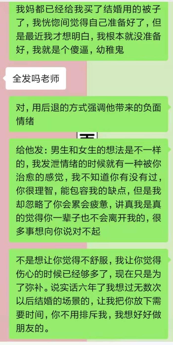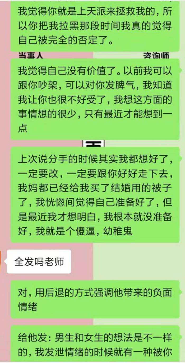 为什么我要联系你?——你也知道我没办法说放下就放下的,因为我还想让你帮我度过这个分手期,所以我来了,我想解决咱们之间的问题,这样我才能过去这个坎儿,否则我不甘心。